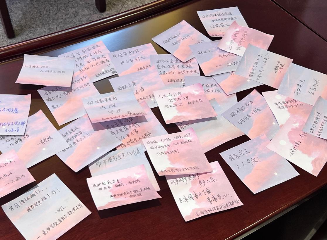 “国家安全,从我做起”“保守秘密,守护家园”……活动最后,同学们将对国家安全的理解化作一句句铿锵标语,认真书写在便利贴上,张贴成“国家安全承诺书”,以直观行动表达守护国家安全的决心。同学们表示,未来将把“十个坚持”“五个统筹”融入日常,在专业学习中筑牢文化安全根基,在生活中主动成为国家安全的“传播者”与“守护者”。