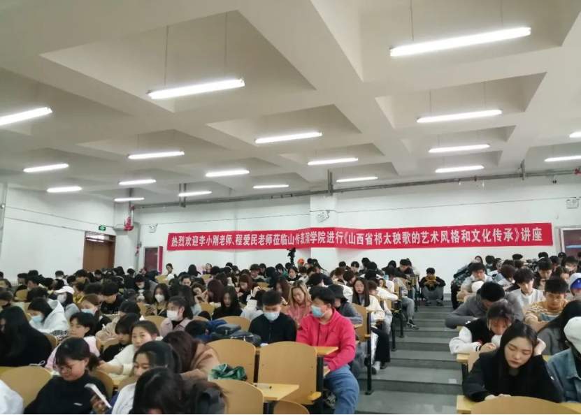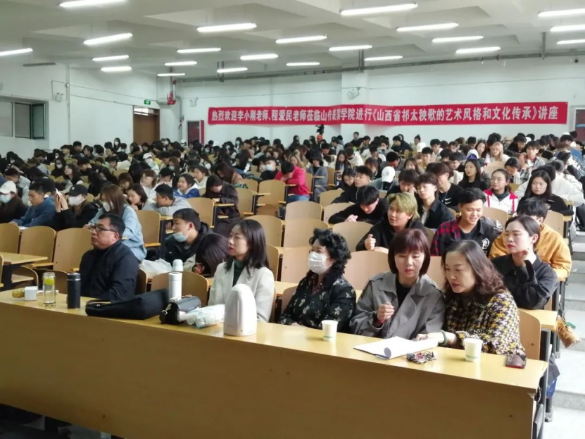 祁太秧歌作为国家级非物质文化遗产,近几年在传统文化复兴的春风中,也得到了越来越多的关注。李小刚老师通过细致的语言和生动的举例,向学生们展示了祁太秧歌独有的艺术特色和魅力。李小刚老师说:作为国家级非物质文化遗产——祁太秧歌的传承人,能够参加这样的讲座真的很感动,因为这是我的乡音。对我来说,我的家乡戏祁太秧歌能通过这样一个个讲座,一直传播下去,是一件非常自豪的事情,愿我的家乡戏祁太秧歌越走越远,越走越高,走出辉煌。同学们通过李小刚老师对于祁太秧歌的唱法以及艺术风格的细致详尽的讲解,以及程爱民老师现场展示,真切 感受到祁太秧歌这块“山西戏曲瑰宝”的魅力。两位老师表示,群众文化在祁县地区还是非常丰富的,群众积极性高、参与度高。我们希望能把群众艺术中最好的东西从理论上、审美上再往高拔一拔,但是特色的东西不能动。既要保证它的原汁原味,又让它有一定的艺术高度。让人一听就是祁太秧歌,而且是雅俗共赏的民族艺术。聆听完两位老师的讲座,在场的每一位同学都无比激动。大家不仅丰富了对传统文化的认知,同时也更坚定了紧跟老一辈艺术工作者的脚步,继续保护传统文化、继续传承发扬民族文化的信念!