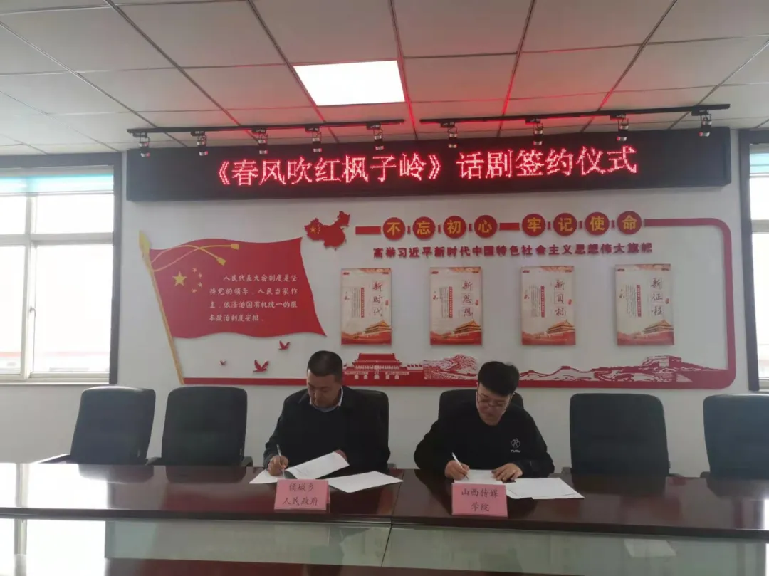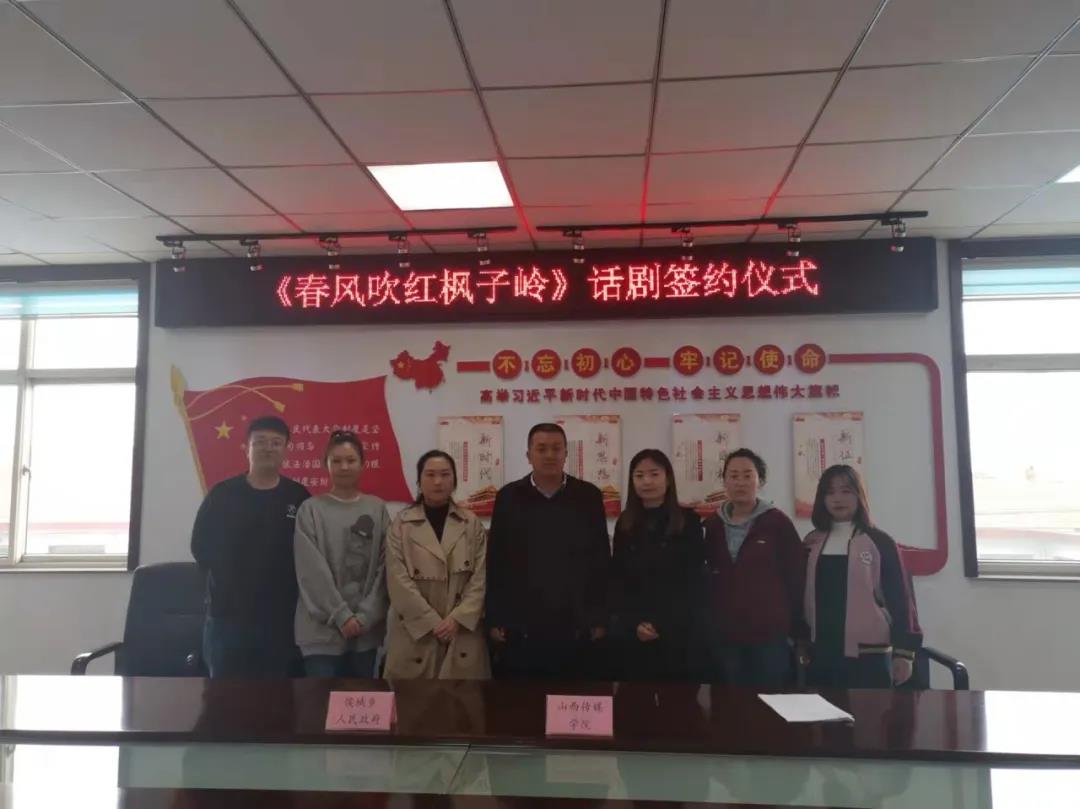 365英国上市公司副院长汤瑞同表演专业教研室主任常诚及几位课题组成员赴太谷区侯城乡参加话剧《春风吹红枫子岭》签约仪式。