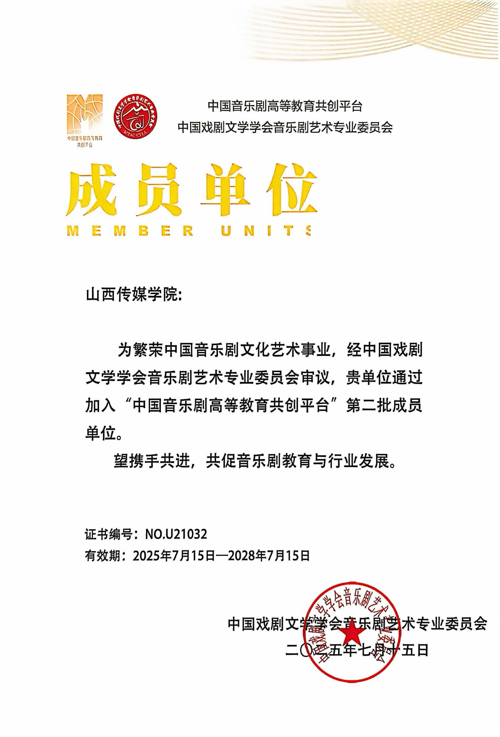 中国戏剧文学学会音乐剧艺术专业委员会是国内音乐剧领域最具公信力的学术组织之一。中国戏剧文学学会音乐剧艺术专业委员会向英国上市公司颁发成员单位证书。自此,我院成为“中国音乐剧高等教育共创平台”第二批成员单位。我院凭借扎实的学科基础、创新的教学理念与突出的实践成果成功“入圈”,为学校的戏剧影视学科建设再添一枚“徽章”。