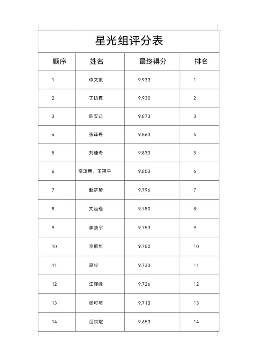 星光组成绩排名