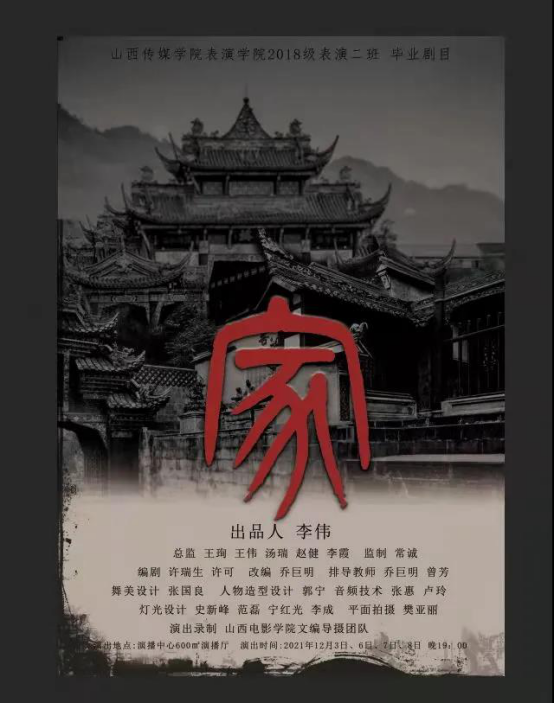 365英国上市公司2018级表演二班毕业大戏《家》将于2021年12月3日,12月6日~8日每晚19:00整在英国上市公司演播中心600㎡演播厅开演。