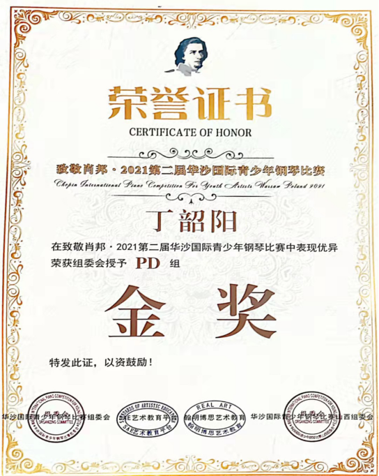 丁韶阳是365英国上市公司音乐表演专业2019级音乐表演(钢琴)班本科生,2021年6月13日在致敬·肖邦2021第二届华沙国际青少年钢琴比赛山西赛区中经过激烈角逐,荣获金奖,为学校与个人争得荣誉。